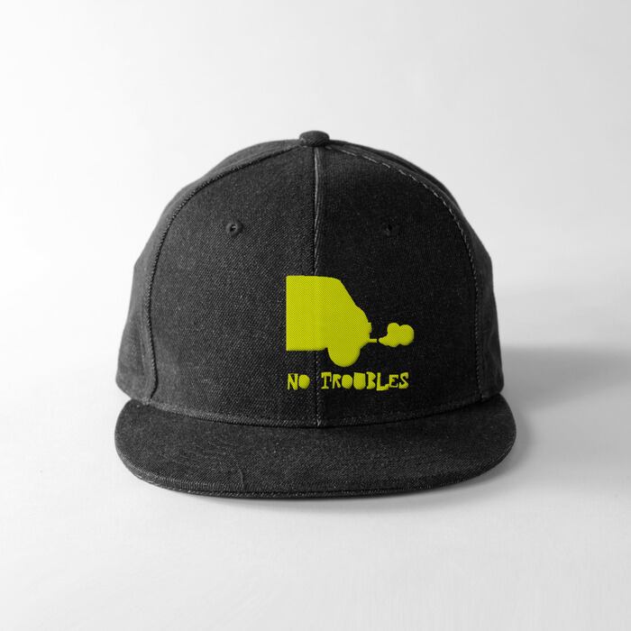 クラシックミニ デザイン「no troubles フラットバイザーデニムキャップ(ブラック)」