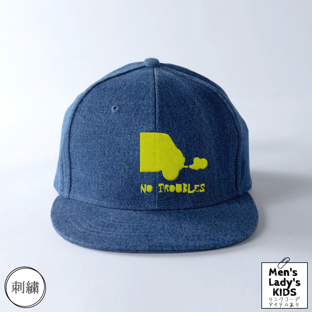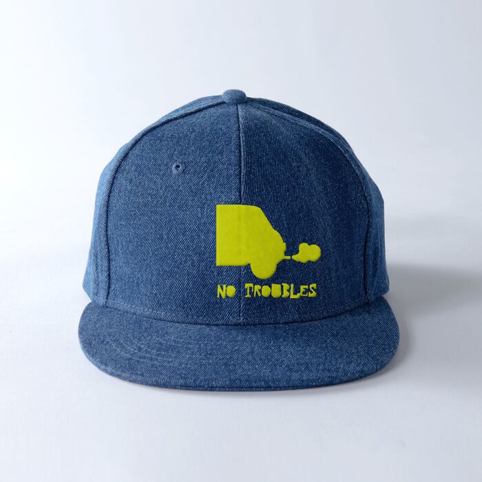クラシックミニ デザイン「no troubles フラットバイザーデニムキャップ(ブルー)」